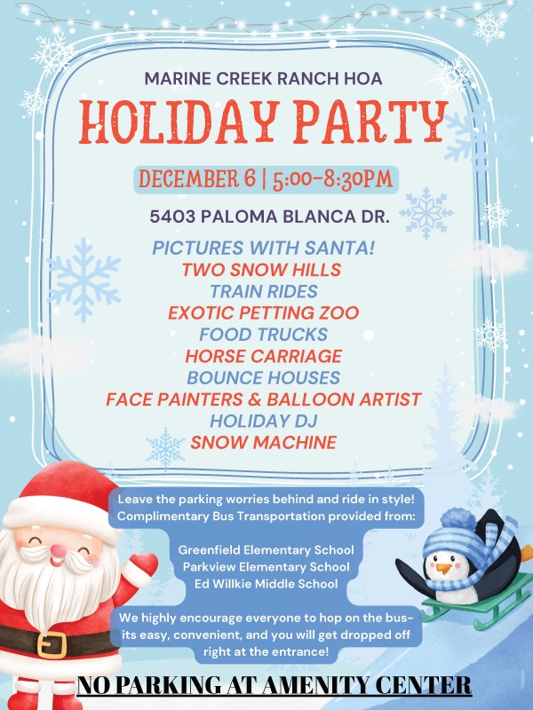 Per the governing documents of the Marine Creek Ranch Homeowners Association, there will be an Annual Meeting of the members on Monday, March 24th, 2025, at 6:30 p.m. at Eagle Mountain Saginaw Central Administration Building, 1600 Mustang Rock Rd, Fort Worth, TX. The meeting will be held for the following purposes: